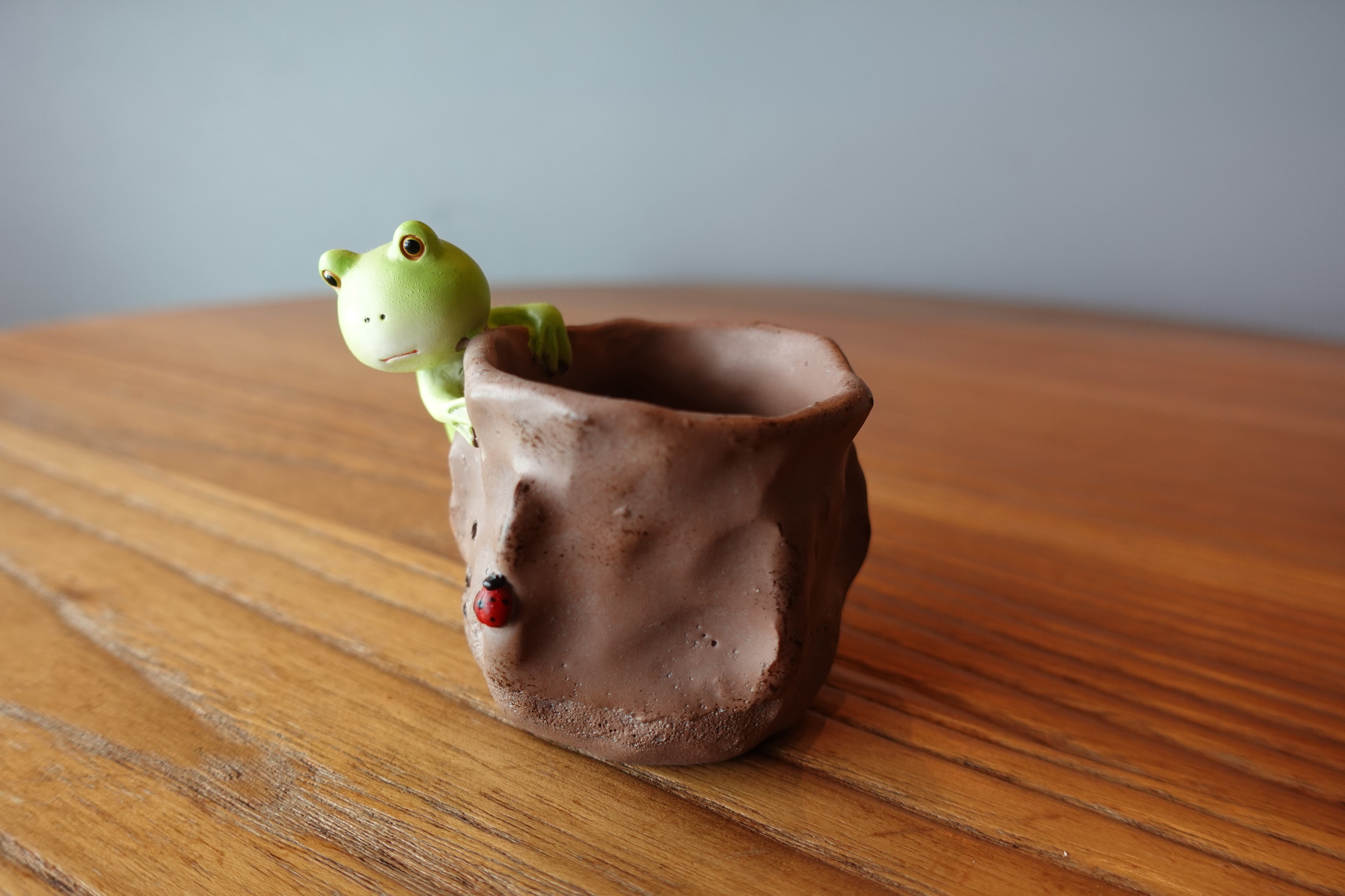 本体サイズは約7×6.5×6cmで、コンパクトながらも存在感があります。素材は樹脂製で、軽量ながら安定感があり、安心してお使いいただけます。可愛いカエルのデザインは、どの角度から見ても楽しませてくれるでしょう。